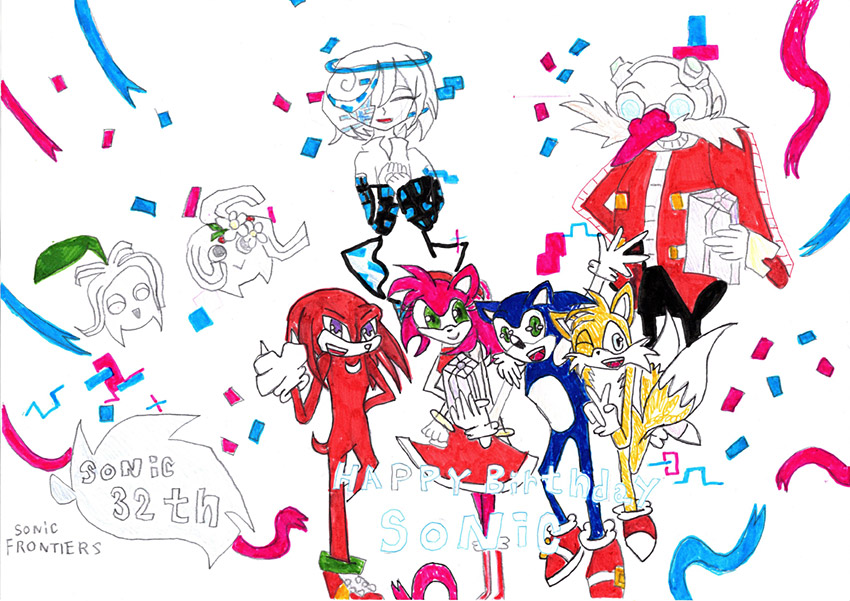 ソニックシリーズ生誕32周年おめでとうございます!!!そしてソニックオリジンズプラス発売も兼ねているのでクラシック組も描きました。クラシック組はソニック以外初描きです。クラッカーから飛び出してるような感じで描きました