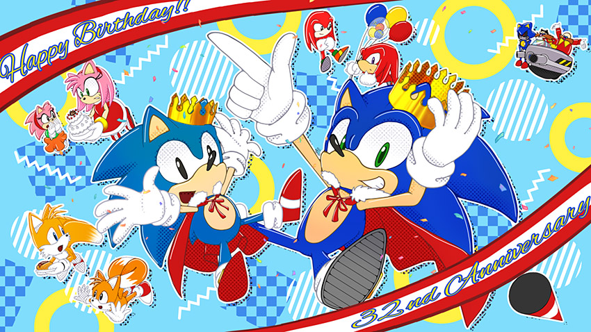 ソニック生誕32周年おめでとうございます!ネオンやレトロをイメージしてソニックの32周年のイラストを描かさせて頂きました!これからもソニック達の冒険やかっこいい活躍がどのように描かれていくのかとても楽しみですし、ソニックシリーズを通してこれからも素敵な思い出を沢山作り続けていきたいです!
