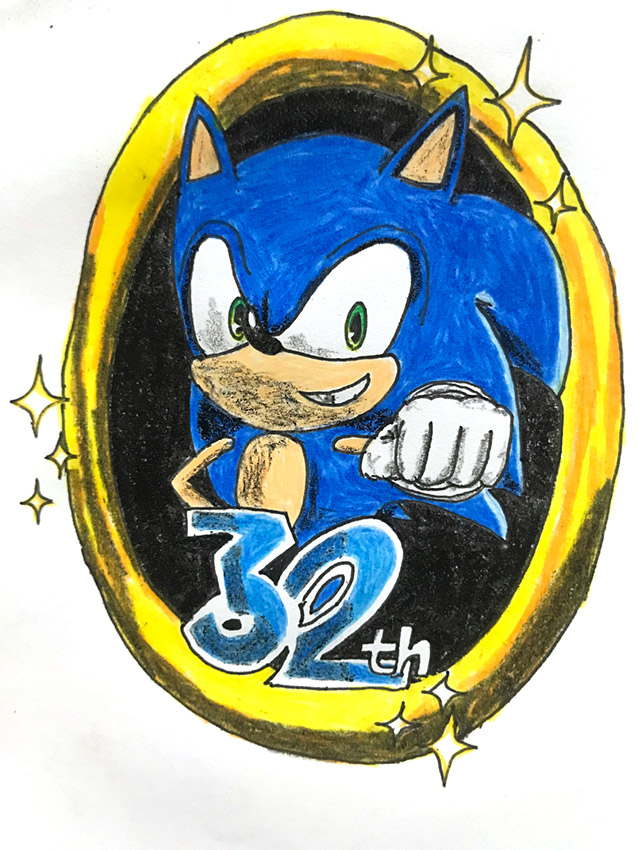 32周年おめでとうございます!32周年とゆうことで!メガドライブのソニック『2』『3』のバッケージ両方を合わせたのとメガドラタワーの『スーパー32X』と愉快なクラシックたちを描きました!これからもずーっとソニック愛してます!!