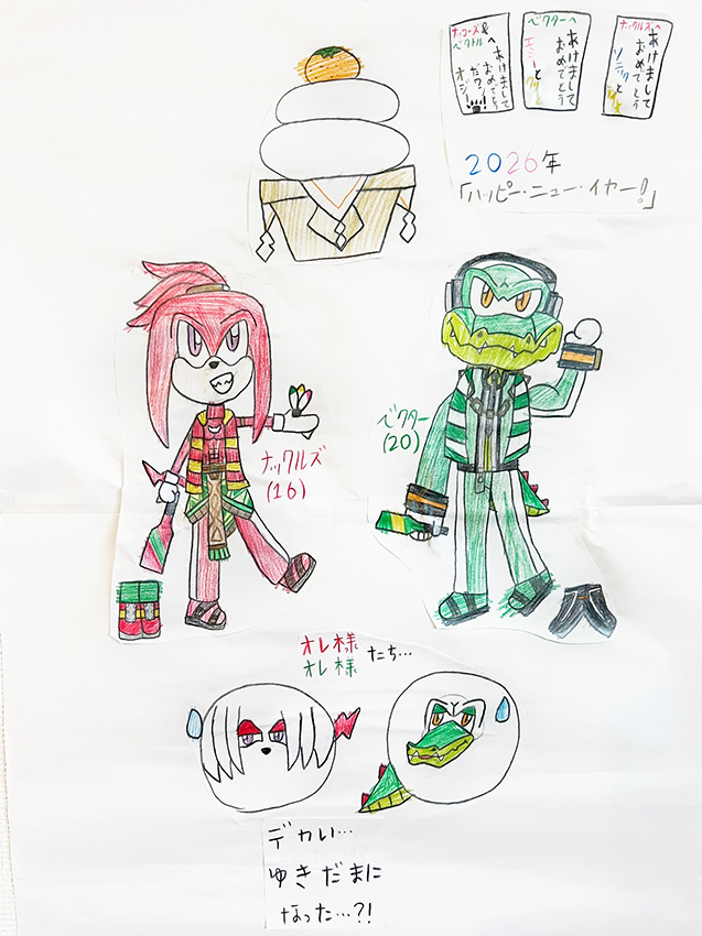 みんな笑顔満点で可愛らしいです!目を輝かせているテイルスの表情も良いですね。これから始まる一年を楽しみにしている気持ちが伝わってきます。