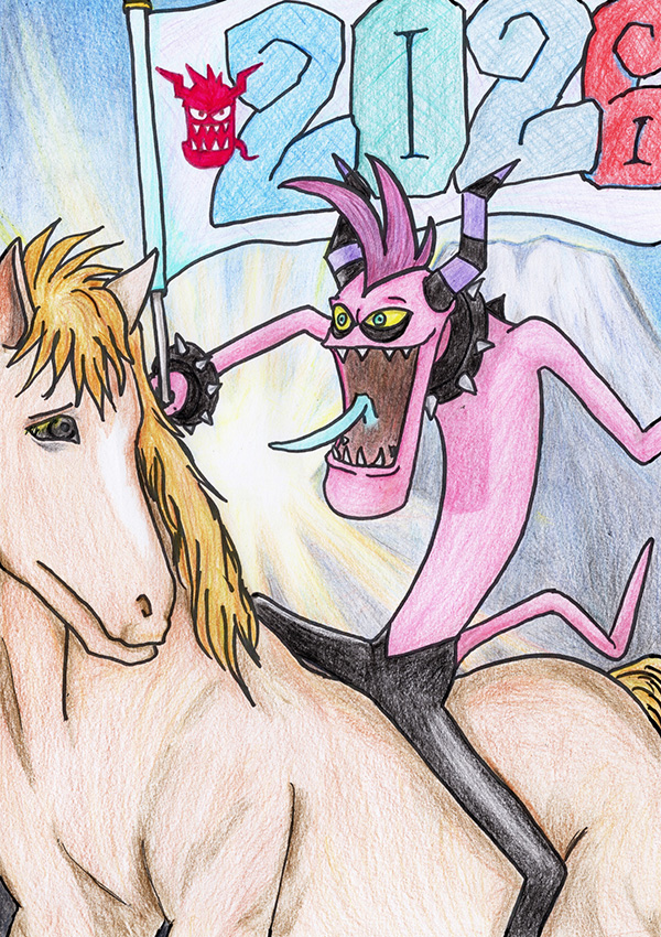午年なので乗馬をするザズを描きました。初日の出の見える絶景スポットで、勢いよく新年を迎えるザズですが。どこからか連れ出された馬は少し困っています。