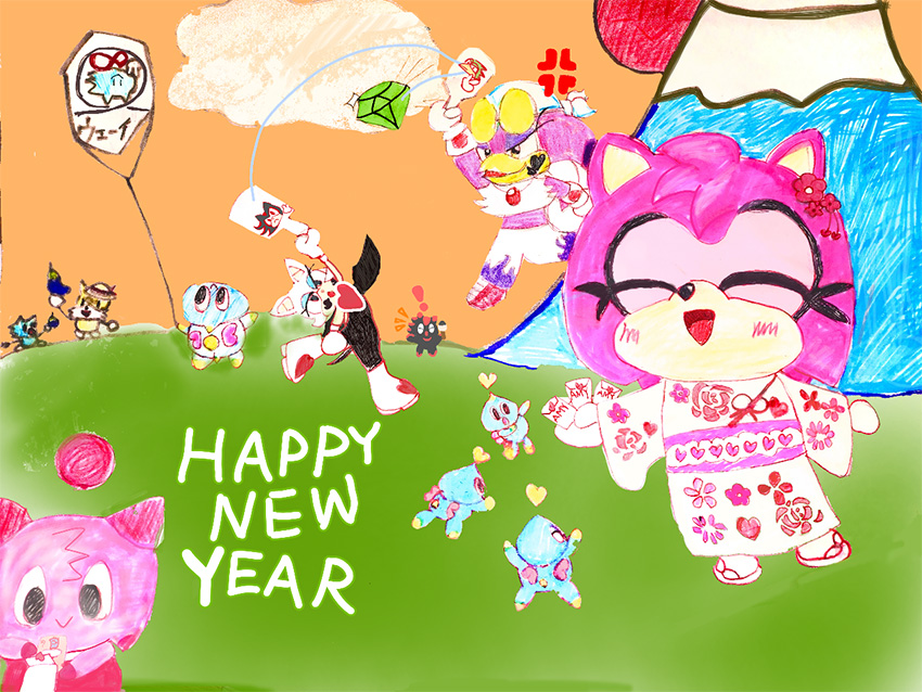 一富士二鷹(ウェーブと羽子板)三茄子(小さい)を描きました。今年もソニックレーシングの可愛いいエミーとウェーブをやり込みたい!