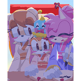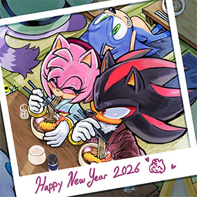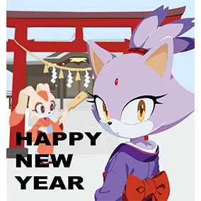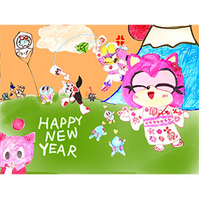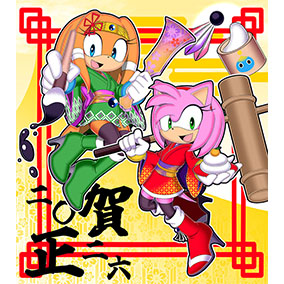 ___お正月だからとご機嫌なクリームはテイルスが作ったおみくじを引いたようです。何が出たのかエミーとルージュは興味津々のご様子。 そんな三人を尻目に、ソニックとシャドウはなにやら羽子板で勝負を始めようとしています___個人的に大好きな女性キャラ三人を描かせていただきました!