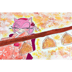 正月らしい女子キャラ3人の晴れ着姿が新鮮で目を惹きます。クリームのおみくじを覗き込む二人の驚きの表情が気になりますがその内容は果たして...?