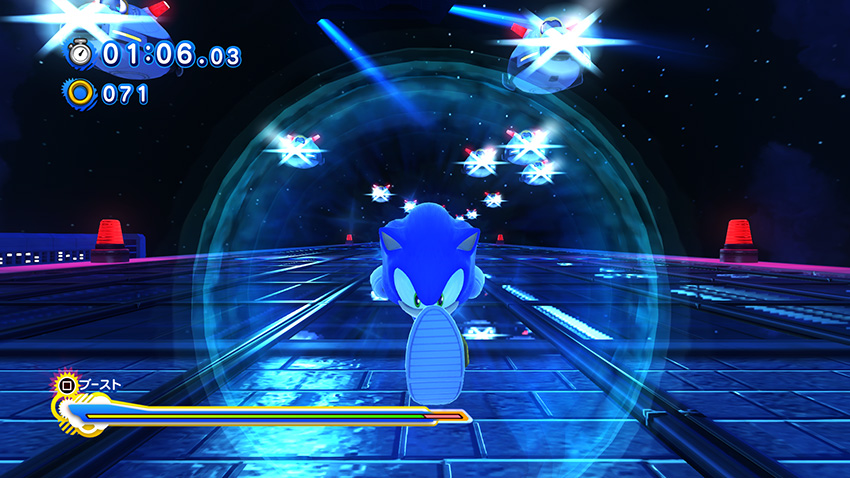 夜の摩天楼に鳴り響くサイレンの音。ソニックの周りだけこの時間は「にぎやか!」。でもソニックは内心「どんなに数が多くっても、俺のスピードについてこれるヤツはいないだろ!!」とか思ってたりして。