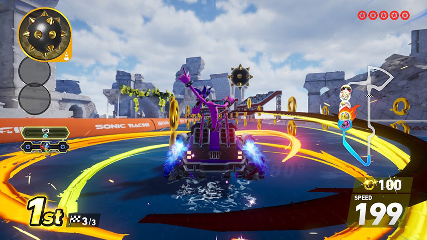 スリル満点、大迫力の一枚!超巨大イカの口に突撃!と思いきや、トラベルリングへ!クラーケンベイのミニマップ演出は、遊び心満載ですよね。全速力のソニックも、このカオスっぷりに目を丸くしているかも!?