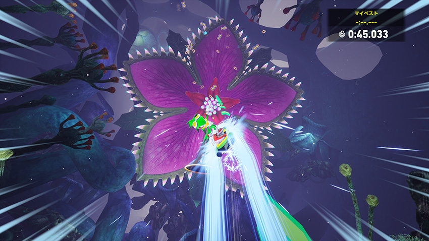 イカのゲソに当たらないかヒヤヒヤするこのコース、最後はイカの口に突っ込むという(笑)...。一秒一秒目まぐるしく変わっていくレース中には、そんなこと気にするライバルはいなさそう。