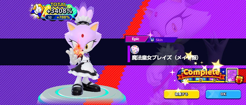 魔法皇女ブレイズ(メイド服)の獲得、おめでとうございます!「異世界大喜利」をリアルタイムで楽しんでくださっていたからこそ、3D化の喜びもひとしおですよね♪ソニックチャンネル発のスキン、これからもどんどん増えていってほしいですね!
