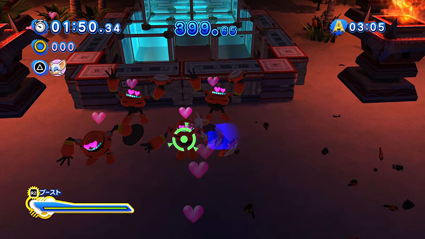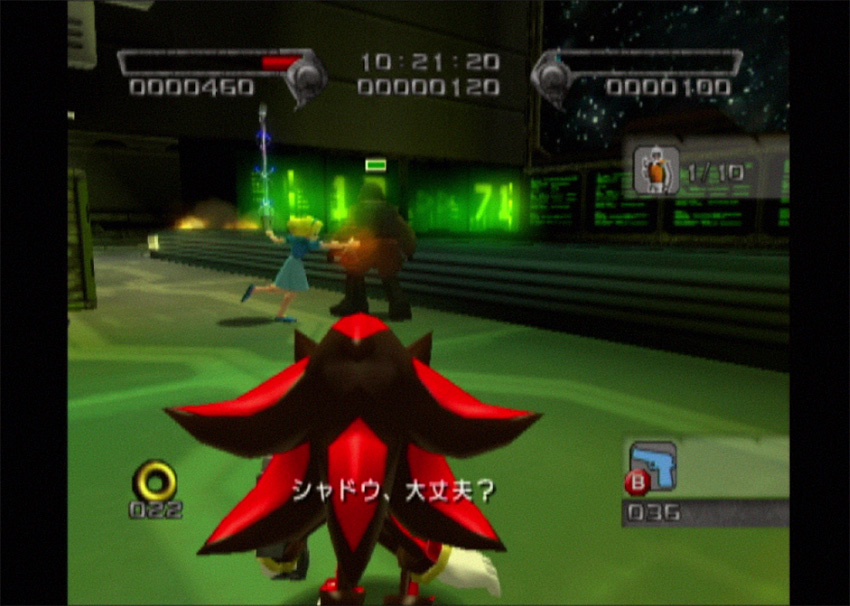 『シャドウ・ザ・ヘッジホッグ』のミッション・キャラクターは2Pコントローラーで操作できるのでプレイアブルなマリアです。完全武装のGUN兵士に向かって素手で「えいっ!やぁ!」攻撃です。ダメージ数値としては非力ですが、視覚的にマリア様超御っょぃ...;