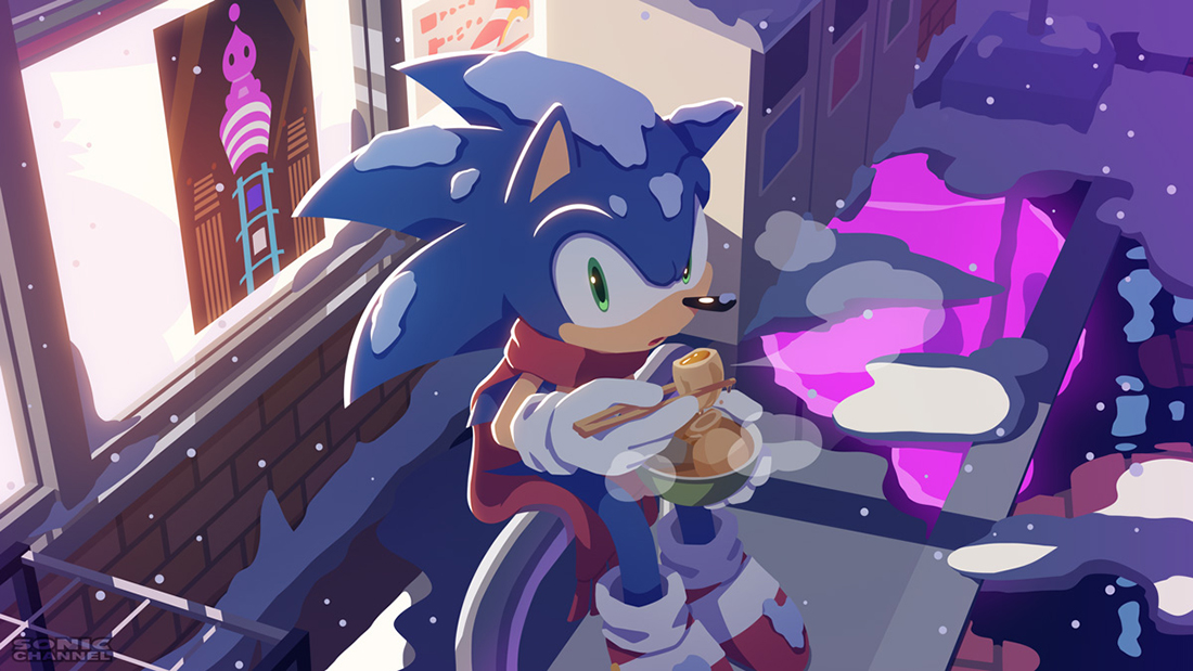 寒々と雪が降る冬の夜空の下、あったかくて美味しそうなコンビニおでんをふーふーしている、オフショット100%超のソニックですね。