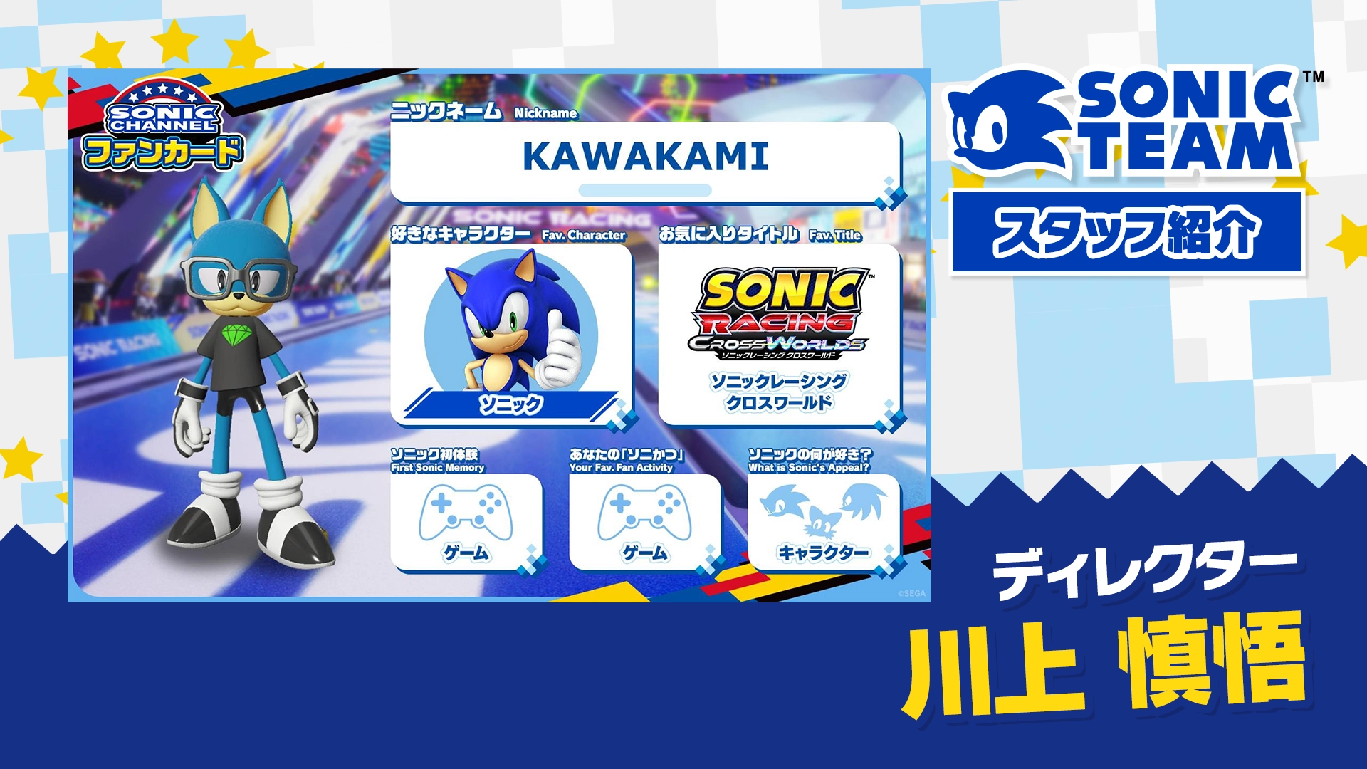 「ソニック」をつくるスタッフたちがどんな人たちなのかを、「ソニックチャンネル ファンカード」などを通じて垣間見えるメンバー紹介のコーナー!