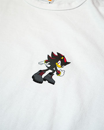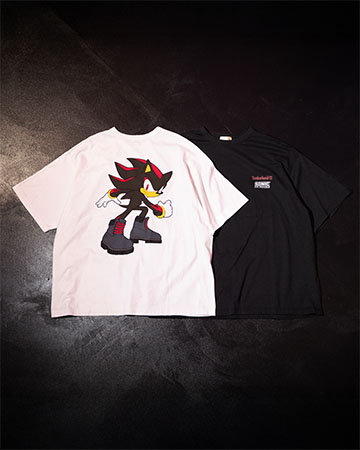 長袖Tシャツは、特別仕様のシャドウを左胸にワンポイントであしらい、右腕に「ソニック」シリーズのタイトルロゴを、左腕にレッドのティンバーランドロゴをデザイン。