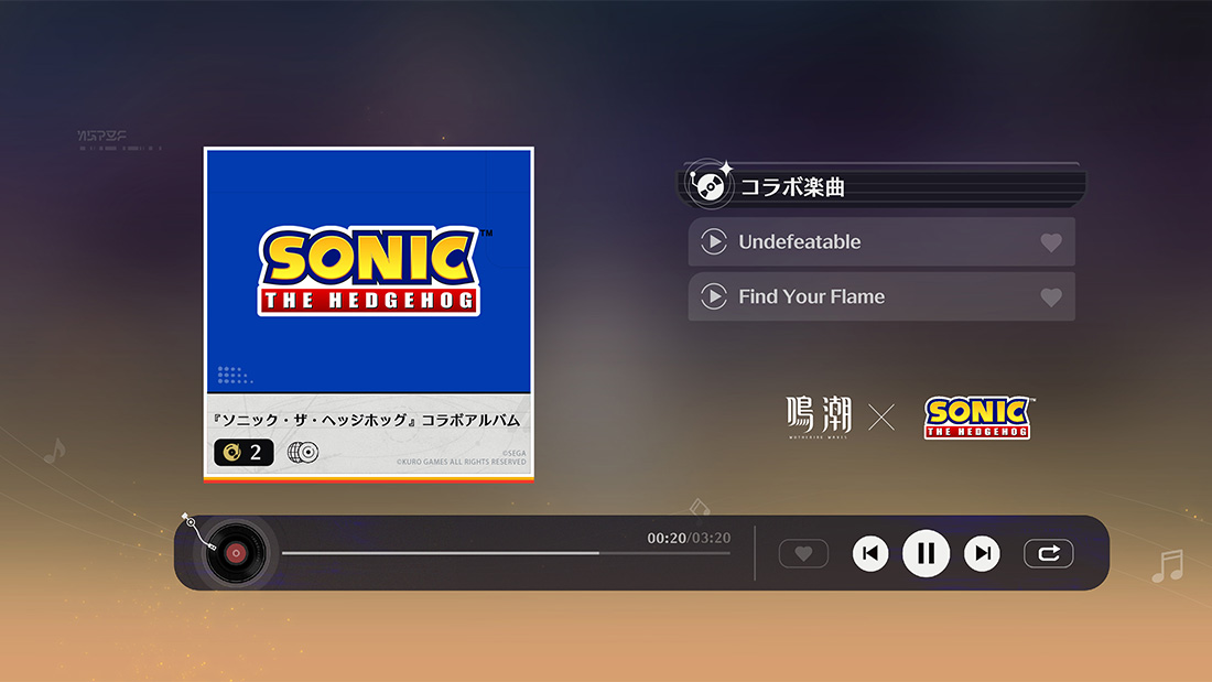 同時に『ソニックフロンティア』より「Undefeatable」「Find Your Flame」の2曲が「フリーチョイス・チャンネル」および「プレイバック」に追加され、漂泊者の皆様はいつでもお聴きいただけます。